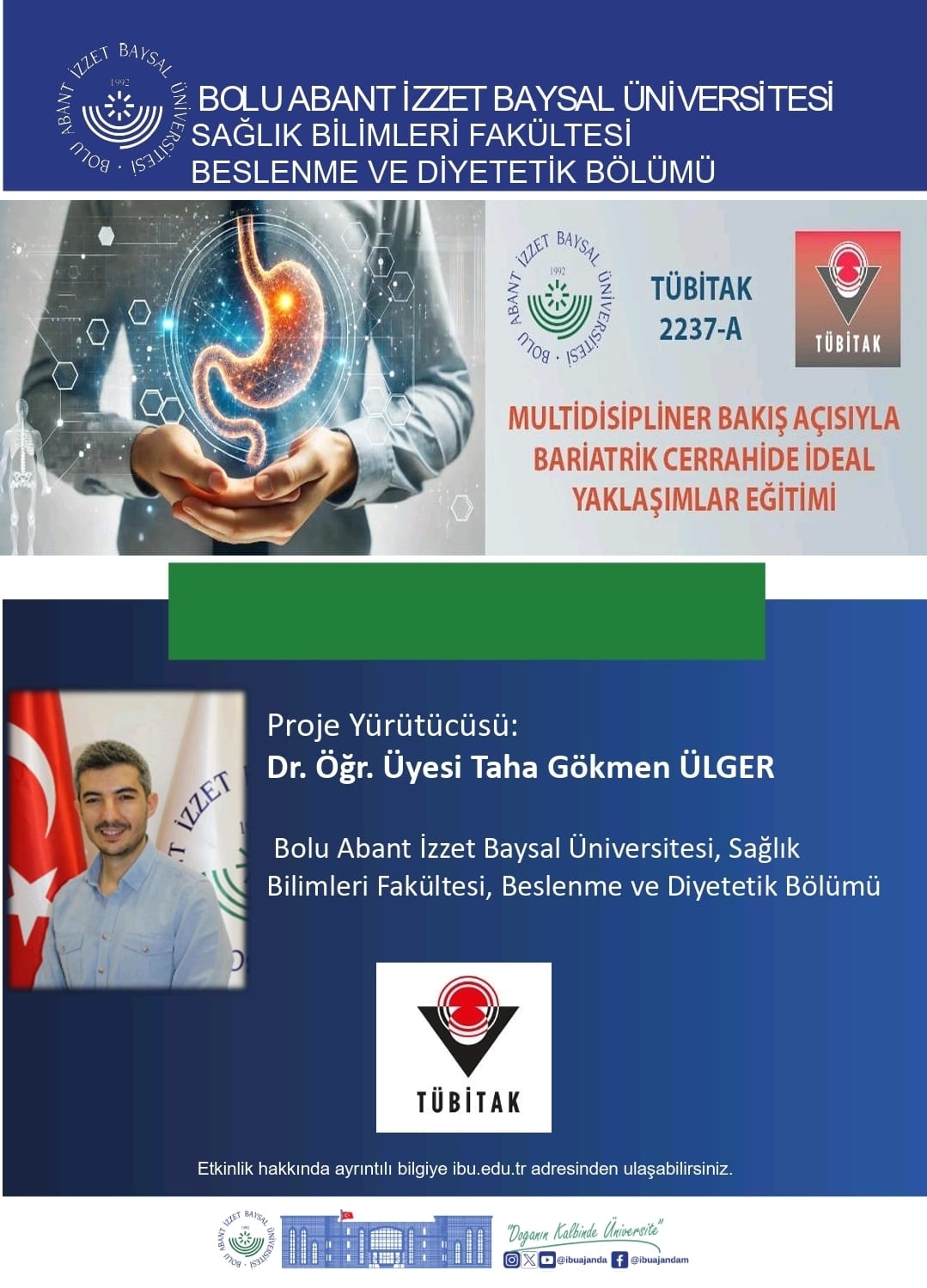 Bolu Abant İzzet Baysal Üniversitesi Sağlık Bilimleri Fakültesi Beslenme ve Diyetetik Bölümü öğretim üyelerinden Dr. Öğr. Üyesi Taha Gökmen ÜLGER’in proje yürütücüsü olduğu “Multidisipliner Bakış Açısıyla Bariatrik Cerrahide İdeal Yaklaşımlar Eğitimi” başlıklı etkinlik, TÜBİTAK 2237-A Bilimsel Eğitim Etkinlikleri Desteği Programı 2024-2 çağrı adıyla desteklenmeye hak kazanmıştır. Projesi kabul edilen öğretim üyemizi ve proje ekibini tebrik eder, başarılarının devamını dileriz.